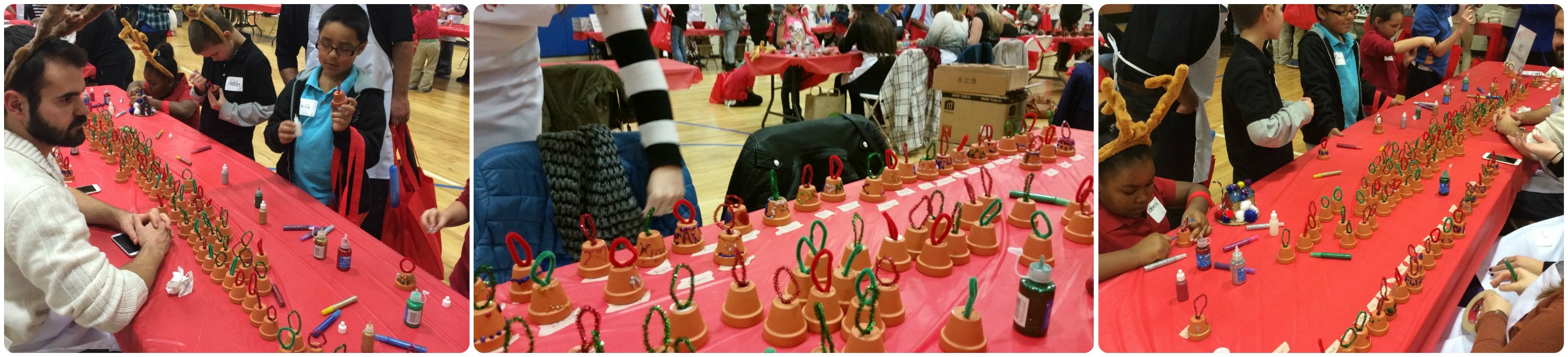 The hc1 volunteers found a unique craft that was simple enough for children of all ages to make: holiday bell ornaments. Ahead of the event, we gathered at our Zionsville headquarters to assemble the bells, prepping them for the children to decorate. Pipe cleaners, bells, and small clay pots were the simple ingredients to create a blank creative canvas. The day of the event, we quickly set up our table and anxiously awaited the children’s grand entrance. The Boys and Girls Club gymnasium was filled with different craft tables, including personalized coasters, plates, face painting, and balloon animals. Christmas music, a giant tree, and a visit from Santa himself completed the festive scene.